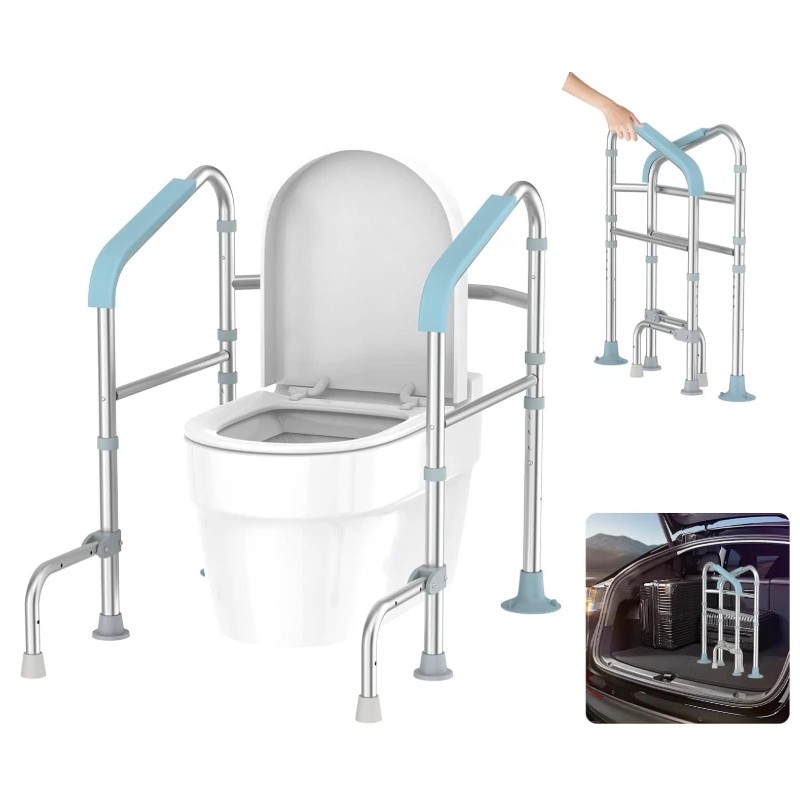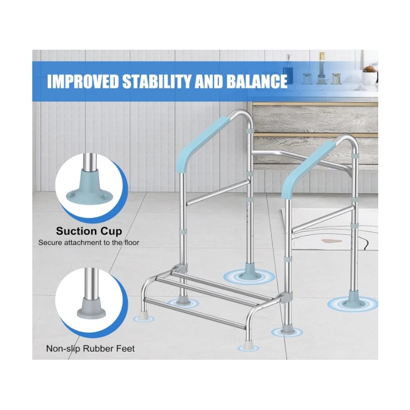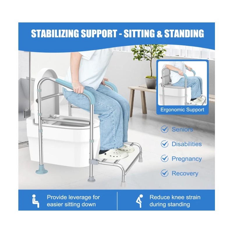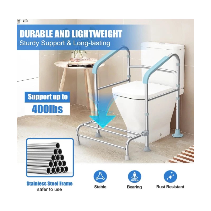 - PACKAGE LIST: 1x stainless steel toilet safety rail with foot rest. NOTE: FOR OPTIMAL STABILITY, DO NOT USE A SINGLE HANDLE WHEN SITTING OR STANDING.