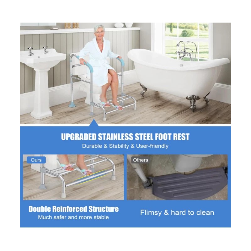- TOILET SAFETY RAILS WITH FOOT REST: UGarden upgraded toilet rails with footrest design, which is locked within the frame, making the toilet frame more supportive and stable during use, helping users to sit and stand safely in the bathroom while providing a comfortable footrest to relax your feet. Unlike other flimsy plastic footrest, our stainless steel footrest not only provides additional stability but also the smooth surface that is safer and effectively prevents scraping your feet skin.
