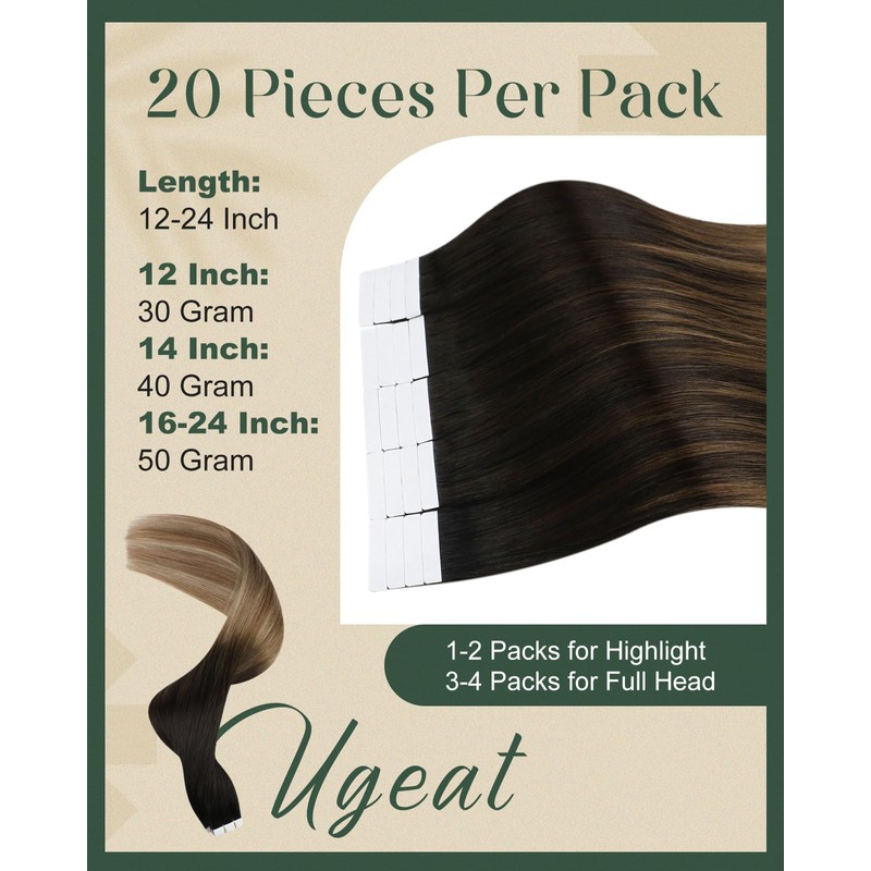 - Specifications: Ugeat tape ins hair extensions contains 20 pieces per pack, and the extension length ranges from 12 - 24 inch. You can choose the perfect length for your hair type. Whether you are pursuing thicker hair volume or trying a new hairstyle, Ugeat tape ins can easily meet your needs, bring you confidence and beauty.