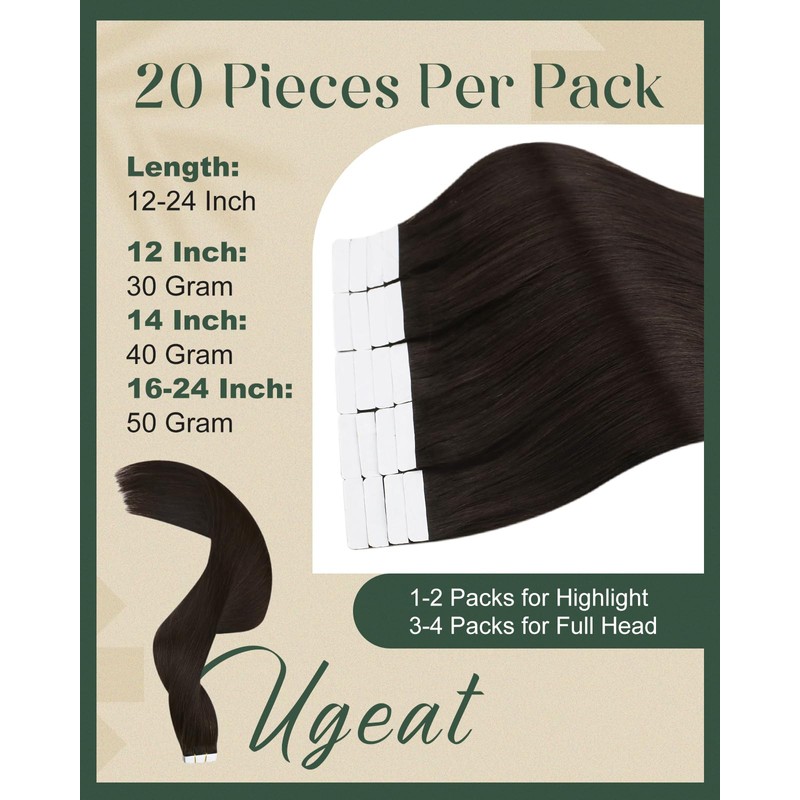 - Specifications: Ugeat tape ins hair extensions contains 20 pieces per pack, and the extension length ranges from 12 - 24 inch. You can choose the perfect length for your hair type. Whether you are pursuing thicker hair volume or trying a new hairstyle, Ugeat tape ins can easily meet your needs, bring you confidence and beauty.