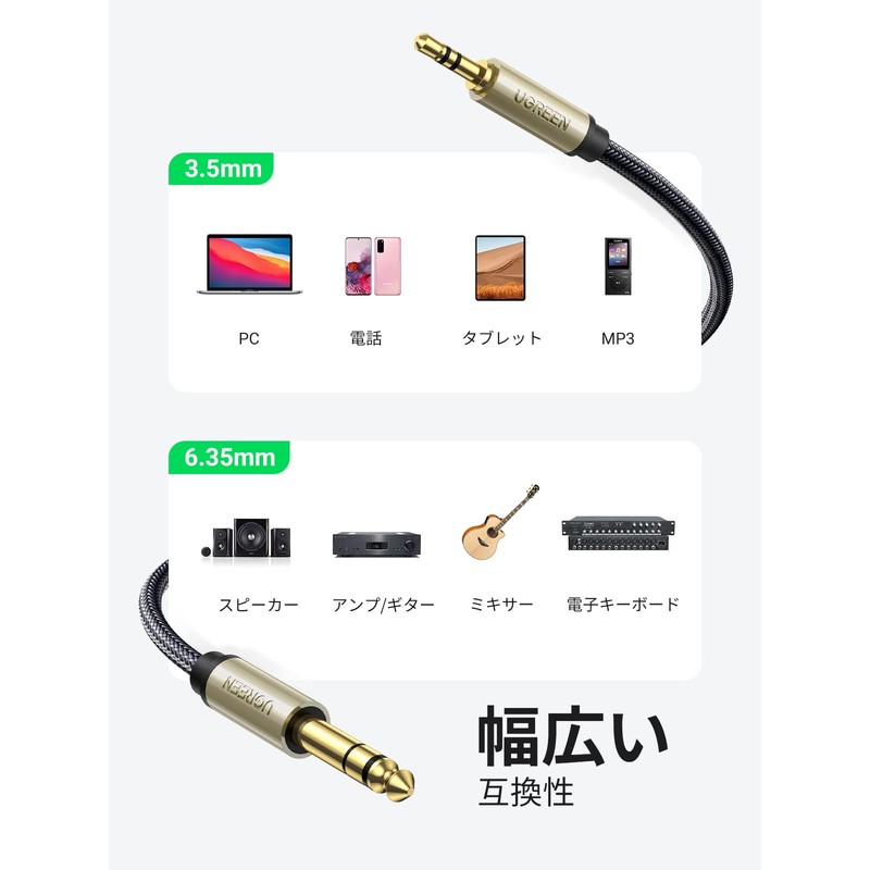 UGREEN オーディオ変換ケーブル 3.5mmミニプラグ to 6.35mm標準プラグ オス-オス ステレオケーブル 1m