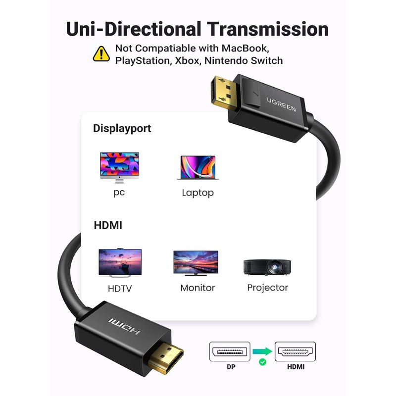 - Stable Transmission: UGREEN DisplayPort to HDMI 6FT Cable with Advanced Processor Chip, which can transmit high-definition video and audio from your computer to an HDTV for video streaming or gaming with stunning clarity and authentic audio. Designed for a remarkable user experience with no visual or audio glitches, artifacts, or audio/video synchronization problems. It is not bi-directional: not support HDMI to DP