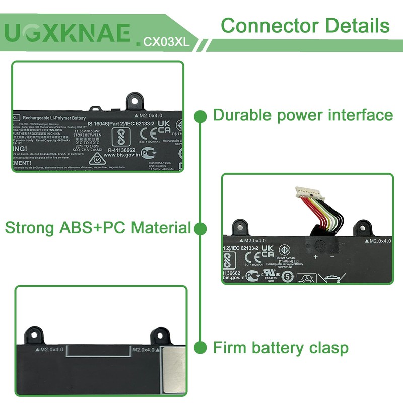 • Specifications: Model Name: CX03XL standard Rechargeable Li-ion Battery; Battery Type: Lithium_ion; Voltage: 11.55 V; Capacity: 53 Wh 4400 mAh.Cells: 3 cells; Color: Black. Packages includes:1x CX03XL Laptop Battery ,2 x Screwdrivers for easy installation,1x Instruction