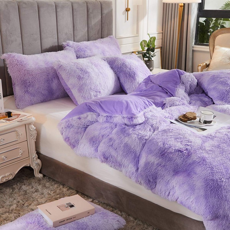 - MATERIALS: Both duvet cover and pillow shams are made from 100-percent polyester microfiber plush shaggy fleece reverse to ultra soft faux suede crystal velvet, modern abstract tie-printing give the room an affluent and very characteristic look. Resistance to fade, wrinkles and pilling. Shaggy plush duvet cover and decorative throw pillowcases could be sold separately in our store.