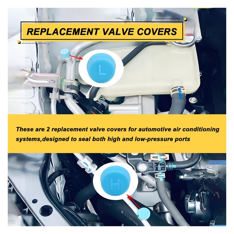 • 【Easy to Use】:This car automotive AC valve cap is easy to install; simply align it with the air conditioning charging port and tighten it directly to complete the installation. The cover surface clearly marks ''L'' (low pressure) and ''H'' (high pressure) indicators, making it easy to quickly distinguish between them, with simple and intuitive operation.