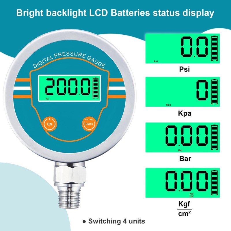 - Multiple Units Display: Offers versatile unit readings in psi, bar, Mpa, and Kpa, making it adaptable for different measurement requirements.
