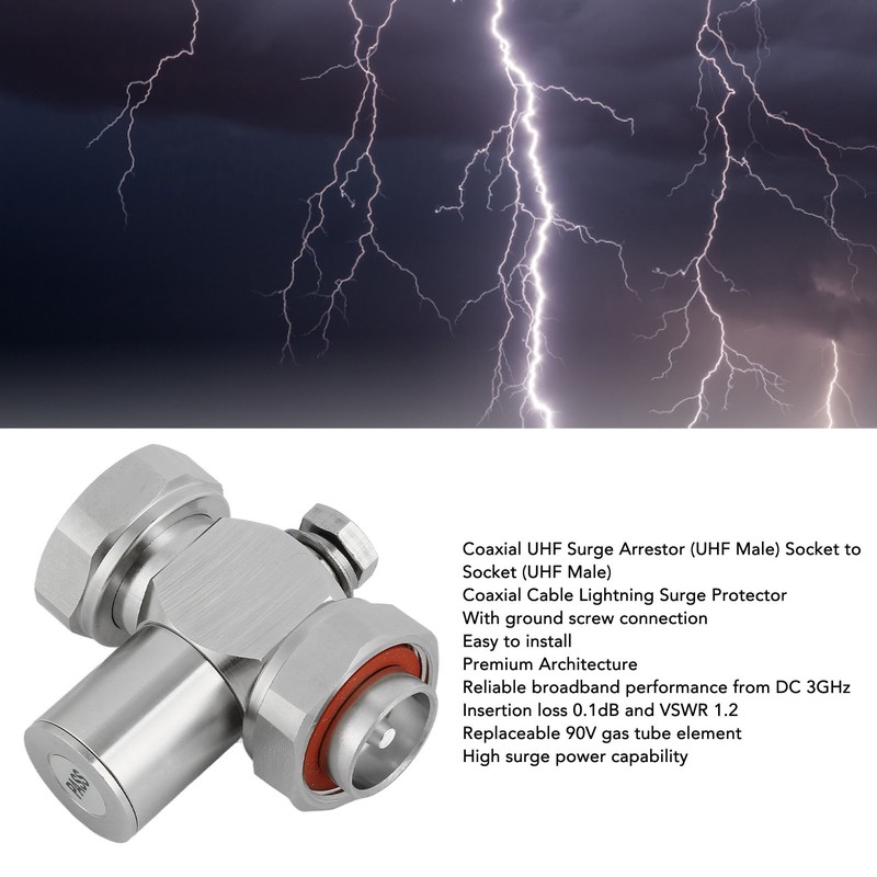 1、MODEL: Coaxial UHF lightning arrester (UHF male) socket to socket (UHF male), coaxial cable lightning surge protector. With ground screw connection for easy installation. 2、HIGH PERFORMANCE: UHF lightning arrester from DC 3GHz for reliable broadband performance, insertion loss 0.1dB and VSWR 1.2, replaceable 90V gas tube element with high surge power capability. 3、APPLICABLE OBJECTS: UHF coaxial lightning arrestor defend your life, the protector provides extremely low loss HF VHF UHF other frequency equipment. Suitable for CB radios, HAM radio equipment and two way base stations. 4、INSTALLATION LOCATION: Lightning arrester is installed as close as possible to the equipment to be protected, usually at the location where the coaxial cable enters the building, or it can be installed near the antenna to provide additional protection. 5、1/4 WAVELENGTH: Theory and practice have proven that the transmit and receive conversion efficiency of an antenna is higher when the length of the antenna is 1/4 of the radio signal wavelength.