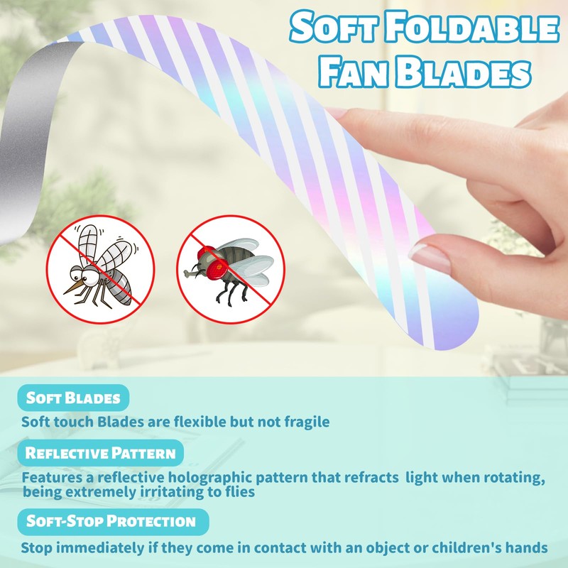 - Double Sided Reflective Blades: Made from high-quality ABS material, this table fan has blades with a holographic strip pattern that rotate steadily at 360 degrees. The sparkling blades create a disorienting effect,physical approach to keeping your food and drinks clean, ensuring a pleasant meal time for you and your family