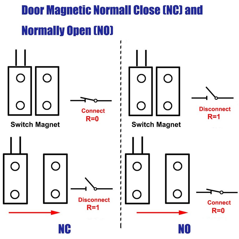 - NC means Normally Closed: When the magnet together, the circuit is conductive (light on); When the magnet separate, the circuit is not conductive (light off).