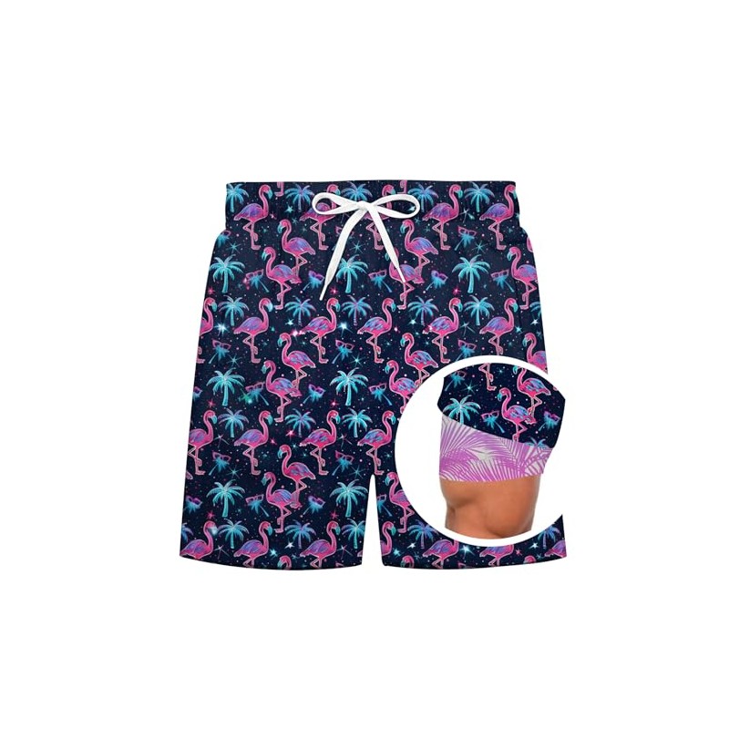 uideazone Board Shorts for Men Neon Flaminogo Swim Trunks Hawaiian Quick Dry Swimming Shorts Summer Beach Bathing Suit with Compression Liner