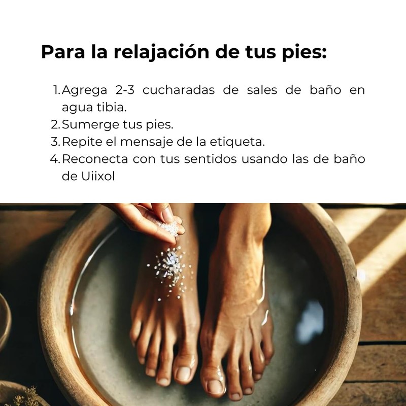 - 🛁 CÓMO USARLAS Para un descanso reparador de pies, disuelve tres cucharadas de sales en un recipiente con agua tibia y sumerge tus pies. Para una relajación corporal completa, vierte 100g de sales en la tina, revuelve hasta que se disuelvan por completo y asegúrate de hidratar tu piel bebiendo agua.