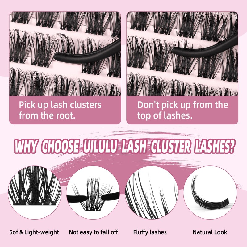 - Easy DIY Application - DIY lash extension kit is designed for easy application, allowing even beginners to master it quickly. Curl your lashes with an eyelash curler. Apply cluster lash extension glue to the roots of false lashes or lightly brush your natural lashes with a lash bond. Then you can stick the lashes clusters under your natural lashes easily