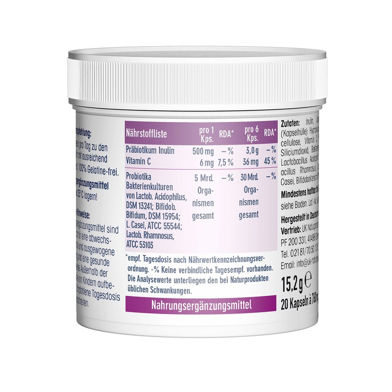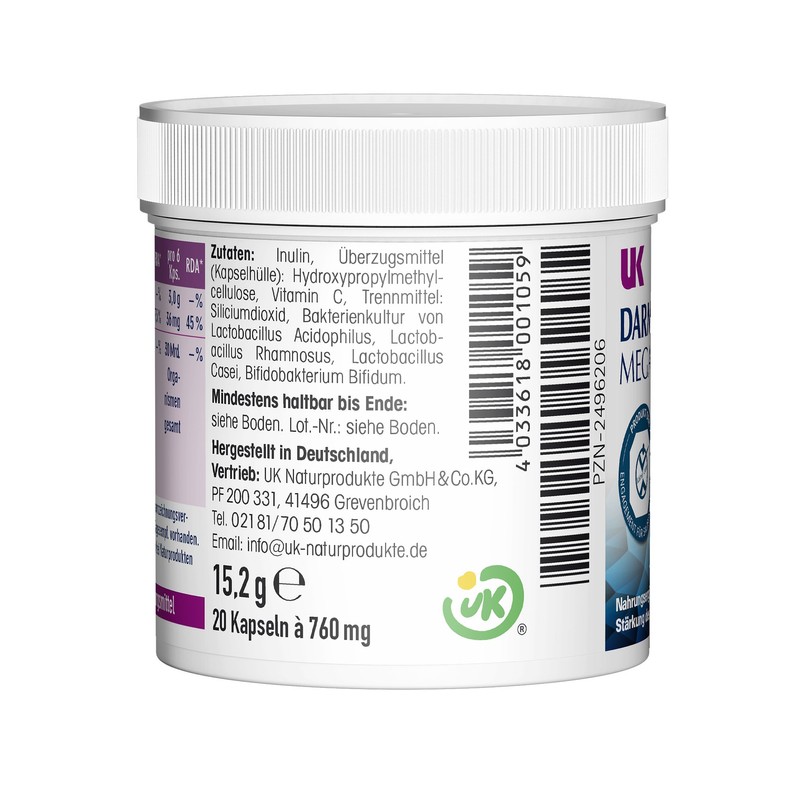 Each capsule contains 5 billion germs. The UK intestinal flora 10 mega capsules are deliberately not encapsulated in accordance with nature, so that the germs can develop in the stomach.