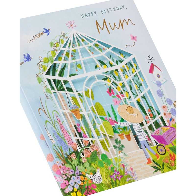 • Celebrate Mum on her birthday with this simply stunning card – featuring a 3D greenhouse design with intricate laser-cut detailing, gold foil accents and vibrant colours.