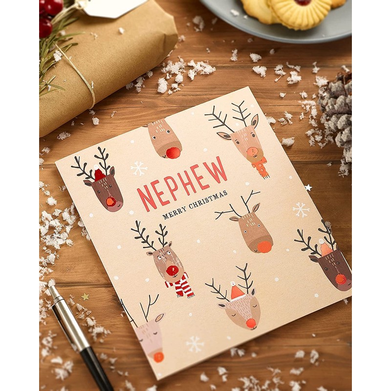 - 🎄 Wish your nephew a merry Christmas with this fun card, featuring reindeer faces with metallic red foil noses!
