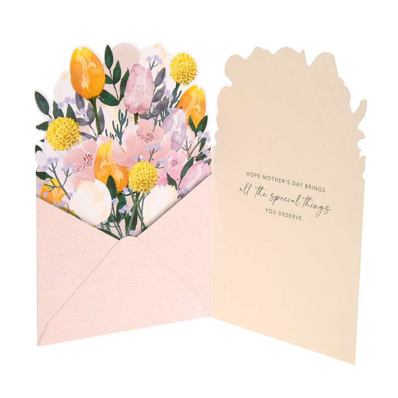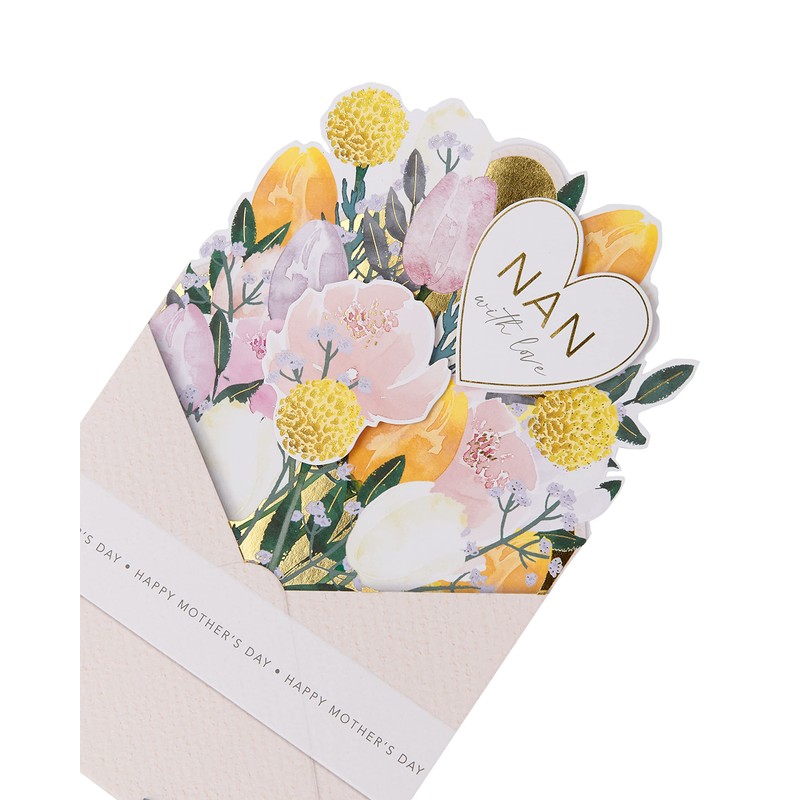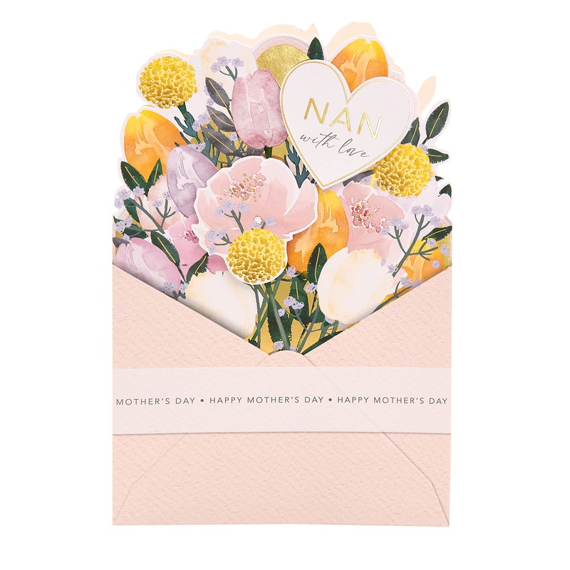 • Wish your nan all the special things she deserves with this bouquet-shaped Mother’s Day card, featuring gold foil and 3D details.