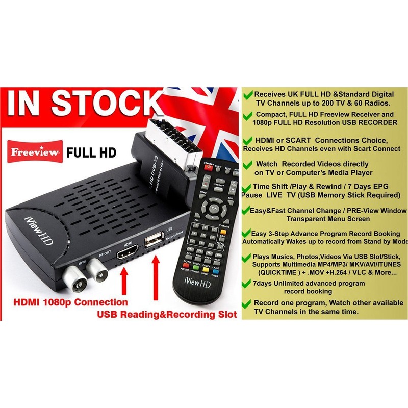UK Mini Scart FULL HD Freeview Set Top Box Receiver Digi Box Digital TV Tuner Terrestrial USB HD Recorder HDMI or SCART Connections (iView HD Mini)