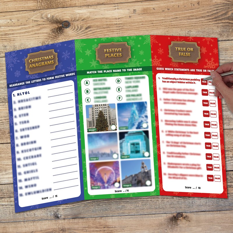 - SIX CHRISTMAS QUIZ GAMES / CATEGORIES 6 different categories and games have been provided: TRUE OR FALSE 10 Christmas related True or False questions | FESTIVE PLACES 6 photographs of different Festive Places to match | CHRISTMAS ANAGRAMS 15 Christmas related words have been scrambled | GUESS THE ITEM 6 close up Christmas related items to identify | CHRISTMAS CHOICES a multiple choice Christmas Quiz | CHRISTMAS FILM TIMELINE 20 Christmas Films to match to the year they were released.