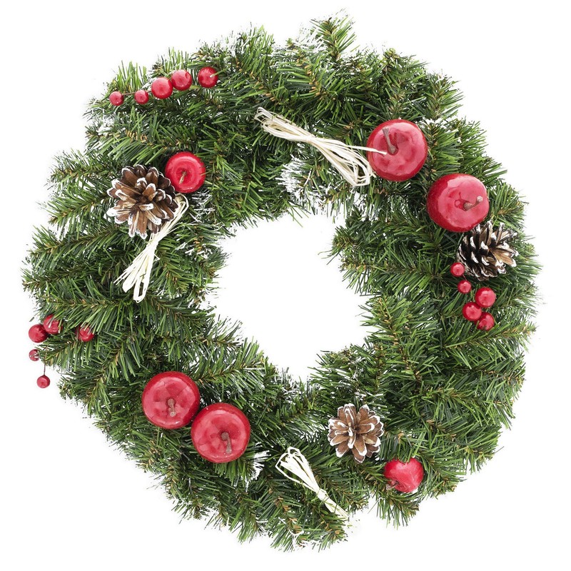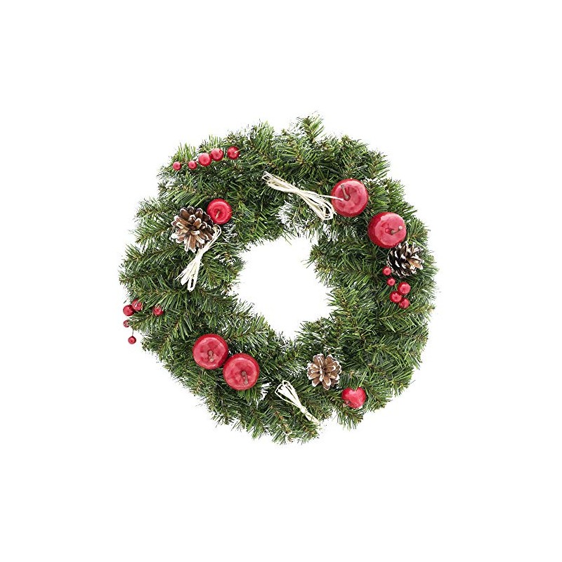 This European Style faux beauty is made with artificial flocked greens, red berries, snow-tipped pine cones, and beautiful straw bows on a grapevine base.