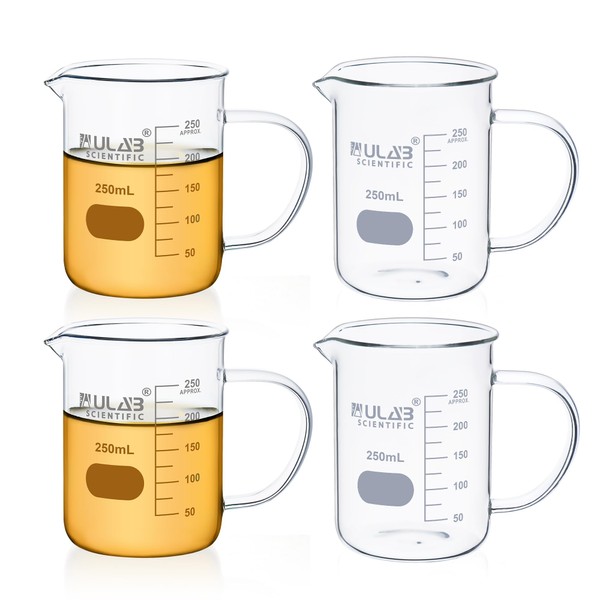 - ULAB Glass Beaker with Handle, Vol. 250ml, 3.3 Borosilicate Griffin Low Form with Printed Graduation,pack of 4,UBG1073