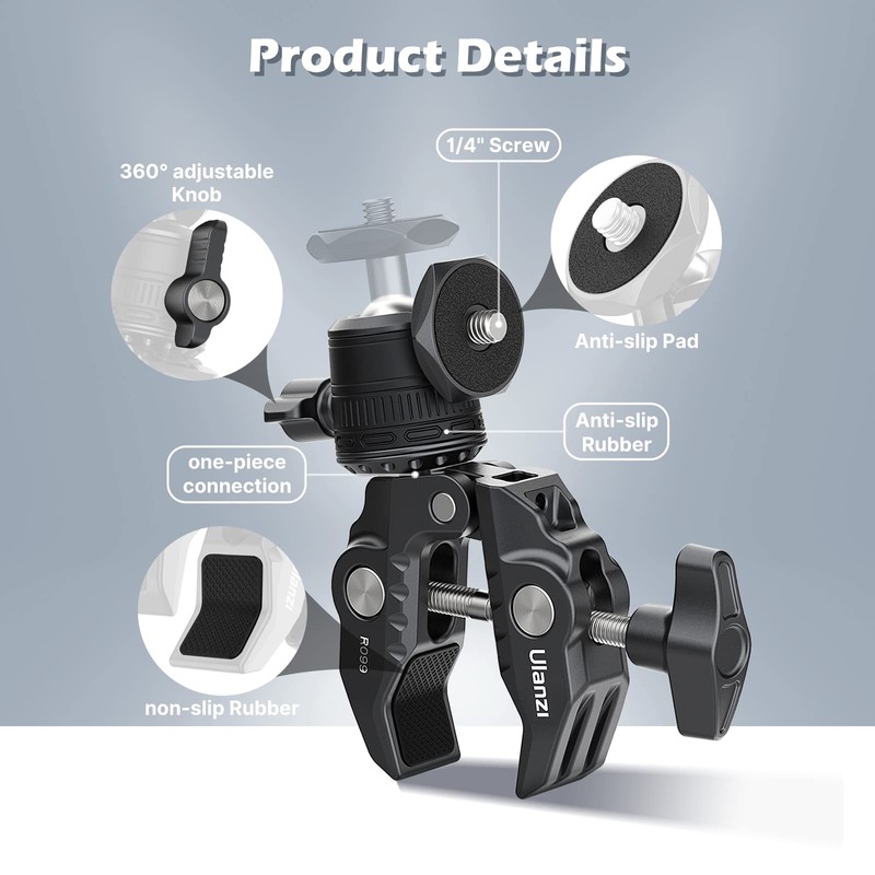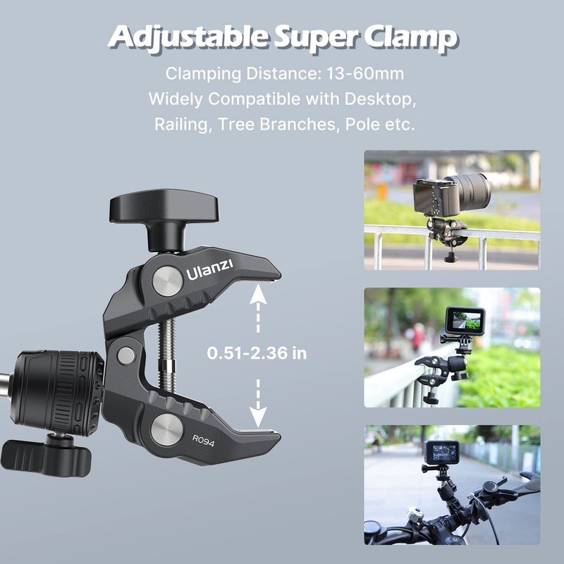 - Super clamp: ULANZI 360° camera mount clamp is designed for video recording. With a maximum opening distance of 60 mm, the foot clamp can be securely held on tables, railings and branches. The clamping distance is 13-60 mm. The clamp tripod can carry a maximum load of 1.5 kg and is suitable for most photo accessories.