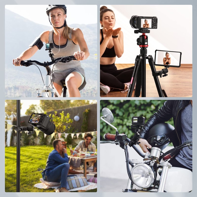 - 360° Rotating Ball Head Camera Clamp: with the 360° rotating ball head, you can freely adjust the angle, support portrait and landscape orientation, and lock quickly with one button. It can be quickly attached and removed from the device, and the position of the device can be adjusted to your needs while recording.