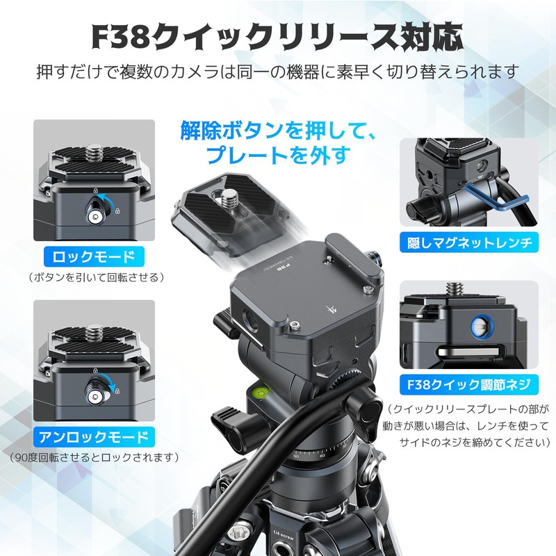 • 【Quick Leveling Ball Head】The F38 tripod head head mount provides proper tension for camera pitch and pan movement by securing the level. Supports 360° panoramic pan and -55° to 90° tilt for easy multi-angle shooting and smooth video shooting. Integrated leveling bowl design allows for quick leveling of camera in one step. Fully adaptable to a variety of complex terrains. Built-in damping balance system, provides smooth operation, ideal for wildlife shooting, bird observation and video shooting with lightweight telephoto lenses and scopes. Level indicates whether the tripod is horizontal. Note: The head has a spring built in and adjust the angle up and down, then lock the adjustment knob in time to prevent the head from automatically leveling