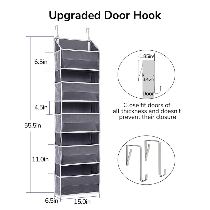 - Versatile - This door pocket is suitable for children's rooms, storage rooms, offices, laundry rooms, bedrooms, bathrooms, dormitories, etc. toys, diapers, wet wipes, baby towels, socks, etc. It is suitable for child’s room behind the door, or bedroom to store cosmetics, hair dryers, kettles, curling irons. With two provided metal hooks, the foldable organizer can be hung over a door with thickness less than 2.0in.