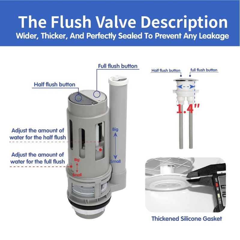 - Premium Materials:The flush valve and button are made from high-quality ABS materials, ensuring durability and performance under varying water pressures and conditions. Additionally, the kit includes a thick rubber seal to significantly reduce the chances of leaks