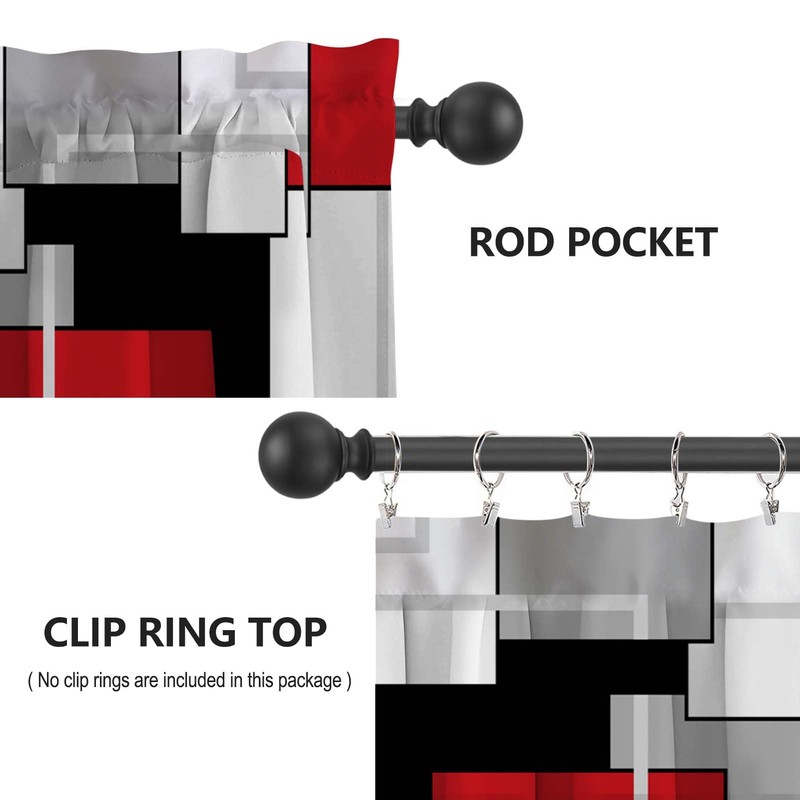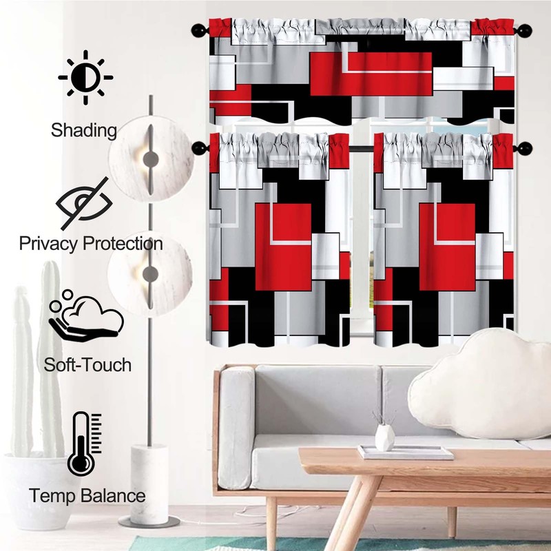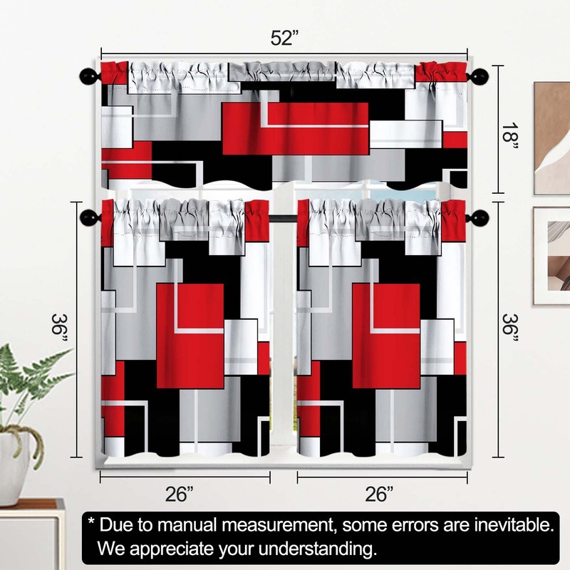 ULQUISNCE Red Kitchen Curtain Valance and Tiers, 3Pcs Geometric Art Valance Set Black Grey Rod Pocket Curtain for Kitchen Window Modern Unique Patterns