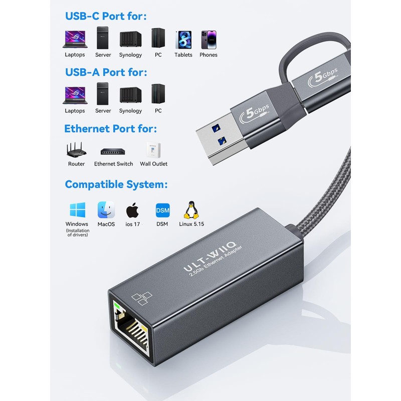 - 【Universal Compatibility】 ULT-WIIQ USB Ethernet Adapter supports USB-A Laptops, PCs, Tablets, NASes and Servers running Mac OS, Windows, Debian, CentOS, Ubuntu, Proxmox VE or other systems which are based on UNIX/Linux.Driver free requires Windows 10 21H2 or later, Mac OS Big Sur or later, Linux Kernel 5.15 or later. Compatible with MacBook Pro 2019, Dell XPS 13/15, Thinkpad T14/X1, etc. It also can work with Synology NASes by installing a third-party DSM driver.