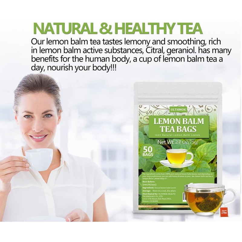 ULTHMOK Premium Lemon Balm Leaf Tea, 50 Bags. Made with 100% Natural Lemon Balm Leaves, No Additive & Caffeine Free, Promotes Relaxation & Support Digestion.