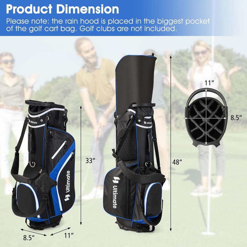 - Rain Hood Included: The waterproof rain hood ensures your clubs stay dry during unexpected showers. Designed for easy mounting, it is hassle-free to set up. And the zippered closure allows for easy access to clubs. The golf bag is also equipped with an umbrella holder. Please note: the rain hood is placed in the biggest pocket of the golf cart bag.