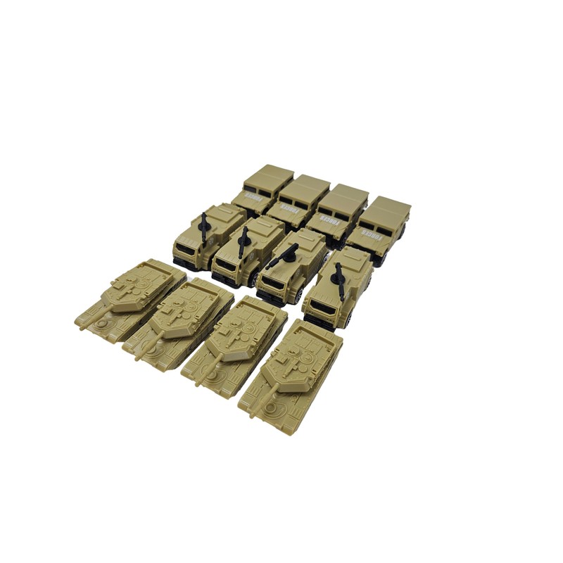 - The 18 assorted military vehicles with wheels measure between 2.5 inches to 3 inches long. They can be deployed as extra coverage if the battle changes to a terrain battle.