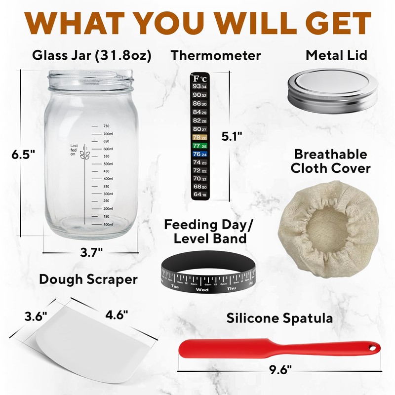 - Your Ultimate Sourdough Bread Starter Kit - Create delightful sourdough bread and pizza bases at home! Benicci high-quality sourdough starters come with a wide-mouth glass jar, feeding date band, thermometer, silicone spatula, cloth cover, and metal lid. We also included a dough scraper that you'll find nowhere else! SOURDOUGH STARTER NOT INCLUDED!