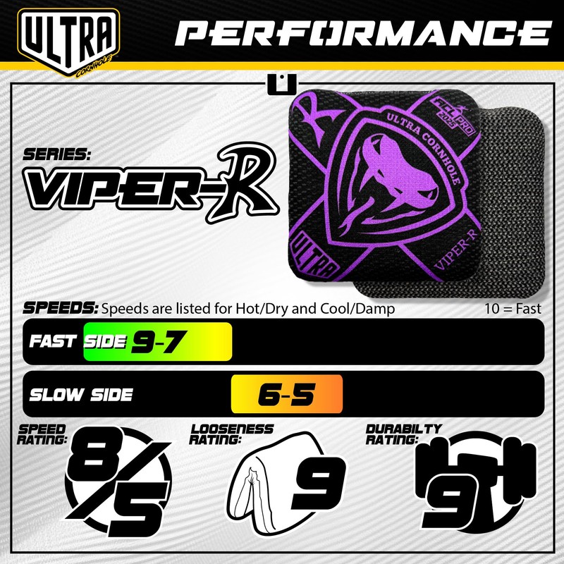 - Two different fabrics: Ultra Cornhole's Viper-R bags utilize two unique fabrics to optimize game play. The fast side is made for speed and durability. The hybrid-carpet slow side is perfect for cutting and rolling bags.