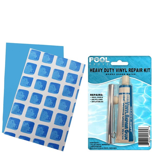 - This vinyl pool liner repair kit from Pool Above includes two (2) rectangular heavy duty pool patches for above-ground pools, each measuring 8.5 inches long and 5.5 inches wide.