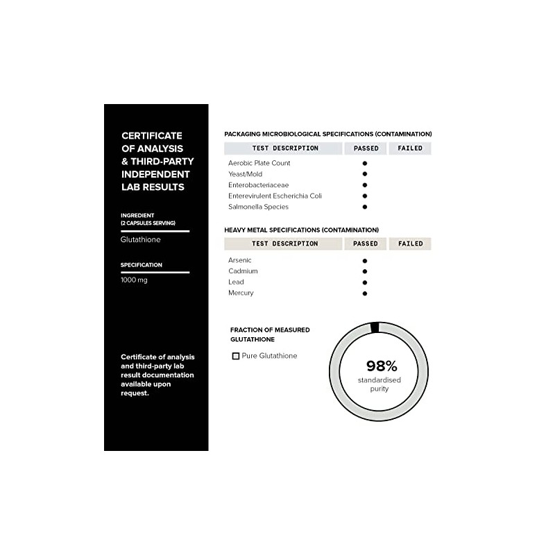 - Highly Purified and Highly Bioavailable - Glutathione has amazing health benefits, but purity and absorption have always been a major challenge; something most other glutathione supplements don’t provide as it requires an extra step (and expense) in the manufacturing process. At a 98%+ purity level, Toniiq Glutathione provides some of the purest, most potent glutathione available.