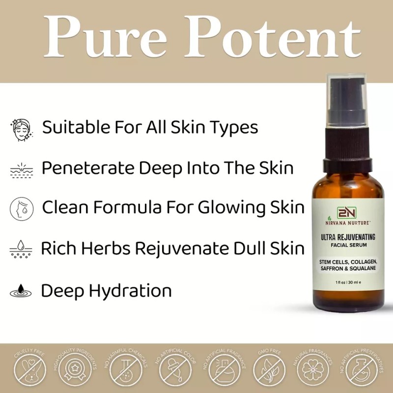 REVITALIZES THE SKIN: Nirvana Nurture Ultra-Rejuvenating face serum harnesses the power of scientifically backed active ingredients, including Plant Stem Cells, Collagen, Saffron, Squalane, Niacinamide, Lotus Extracts, Hyaluronic Acid, Panthenol, and Tocopherol. This powerful blend of nutrients penetrates deeply into the skin where it is needed most and balances moisture effectively  revitalizes the skin and skin glow.