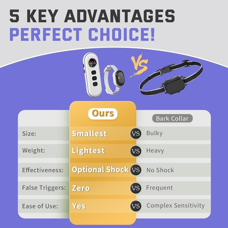 - 【0.01s Effective Bark Control】Unlike other regular bark collars for small dogs, this product not only features a powerful vibration and beep mode but also includes a 100% safe shock mode that can be flexibly turned on or off, with 99 intensity levels for precise control. It allows you to manage barking and training safely and effectively. Additionally, with one click, you can switch between zero-delay mode and long battery life mode, which will help you handle various usage scenarios.