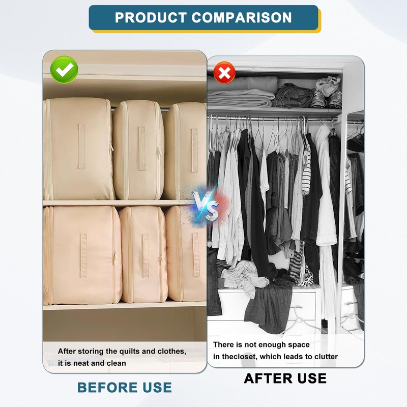 - 【Exceptional Space Saving】The self-compressing organizer can be compressed up to 40% without vacuum. Its additional zipper design on the outside enables it to compress clothes and blankets like a vacuum device, making them flatter and saving space. Simple to operate: just fold the laundry, load it in, and zip it up.