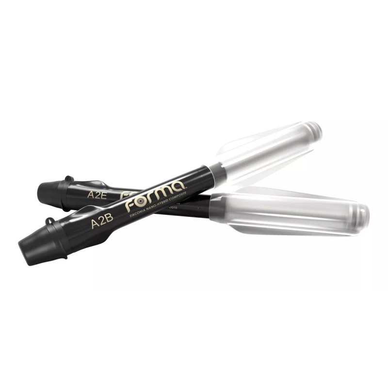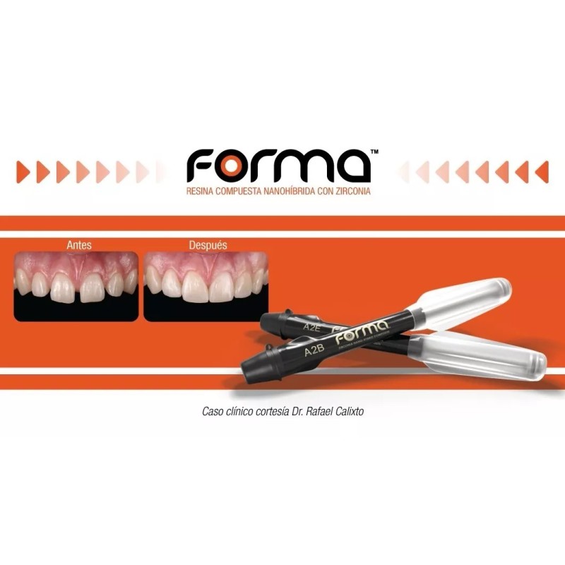 FORMA es una resina compuesta universal nanohíbrida con excelentes propiedades mecánicas, que logra el equilibrio entre la estética necesaria para restauraciones directas y la resistencia y la estabilidad de color que requiere una restauración de alta durabilidad clínica, aún en capas muy delgadas. Su exclusiva fórmula con zirconia y trifluoruro de iterbio le confiere a todos sus tonos exquisitas propiedades ópticas, incluyendo translucidez, opalescencia, radiopacidad y fluorescencia comparables a las del diente natural.