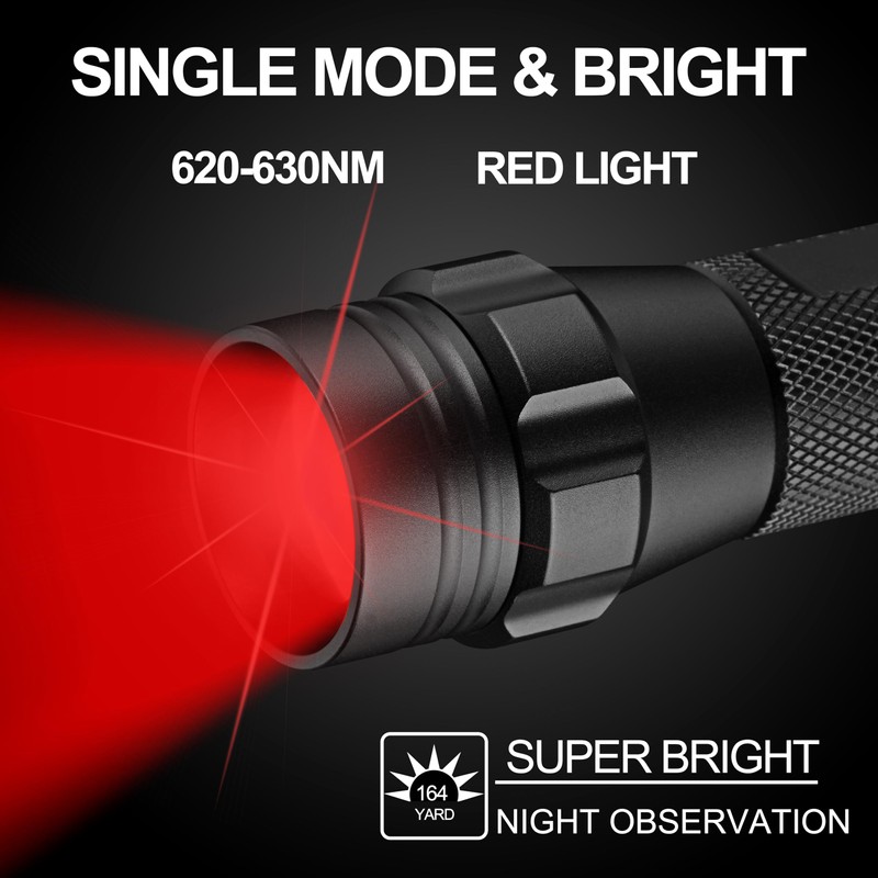 - 【Red Light for Hunting】Red light flashlight is specially designed for night hunting. Human's eyes are most sensitive to red range of light, but animals are not spooked by red light, so red beam led flashlight is very helpful to find animals in the dark, like hogs, coyotes