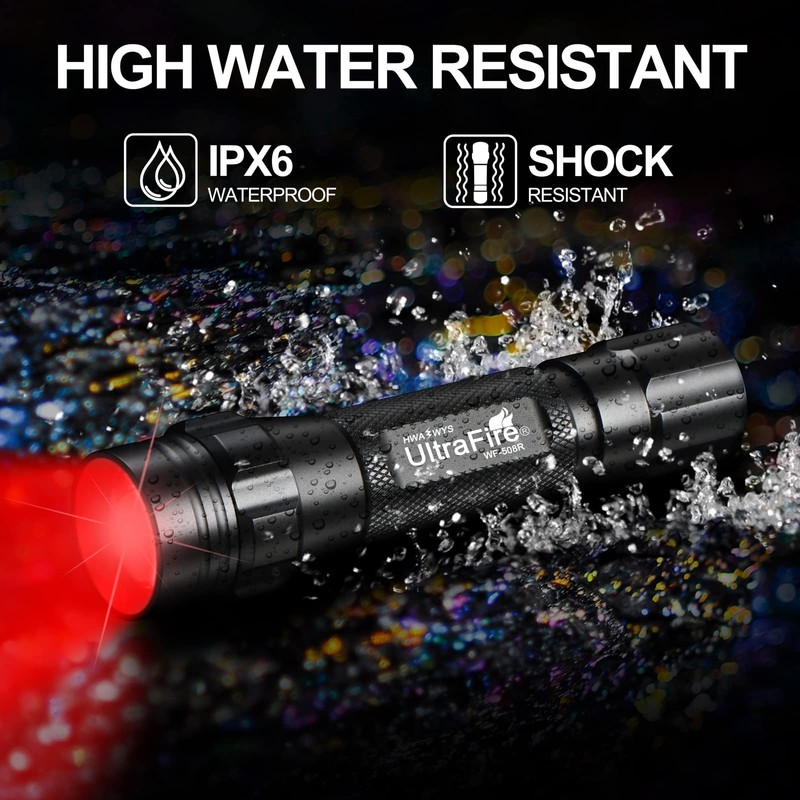 - 【Adjustable and Zoomable Focus】WF-508R Red light flashlight is able to light up near or far just work easily adjusting the zoom.