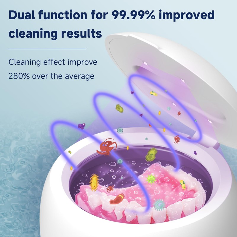 - Latest Technology and LED LIGHTS: The retainer cleaner with 4 efficient U-V lights, Buttons features has two colors blue and white,5min/10min mode can help to clean efficiently and deeply that eliminates odors.The ultrasonic dental cleaner just closes the lid and runs quietly for a serene cleaning experience. Give your retainers, braces, dentures, night guard, jewelry , rings or mouth guard a fresh makeover with denture cleaner. "