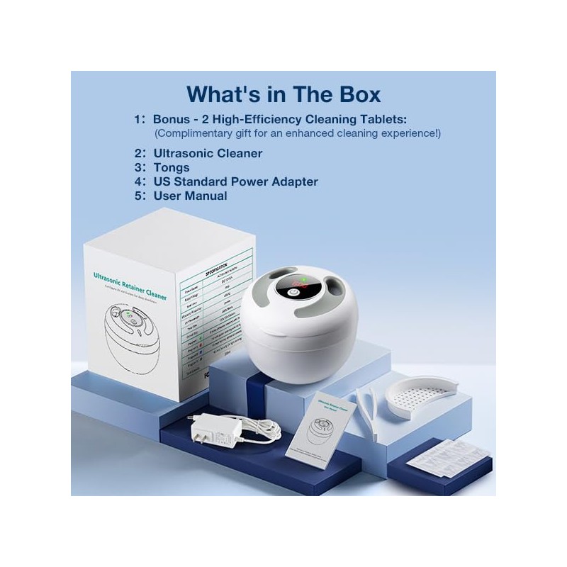 - 4 Versatile Cleaning Modes: Retainer Cleaner Machine offers 4 modes; Ⅰ. 5 minutes of UV light cleaning for the retainer; Ⅱ. 10 minutes of pulsed UV light retainer cleaning; Ⅲ. 10 minutes of ultrasonic cleaning without UV light; Ⅳ. 10 minutes of UV cleaning without ultrasound. Choose different cleaning modes based on your needs, and use with the included cleaning tablets for better cleaning results.