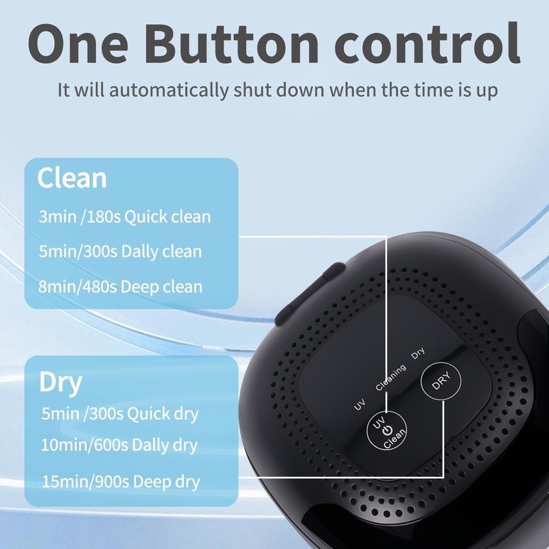 - Professional Cleaning Mode and Drying Function: The protective ring cleaning machine has cleaning and drying modes. The cleaning mode on the left has three time settings (180/360/480 seconds) that can be customized according to your needs. After cleaning, you can also choose the drying mode on the right, which also has three time settings (300/600/900 seconds) to dry your dental instruments and items after cleaning.