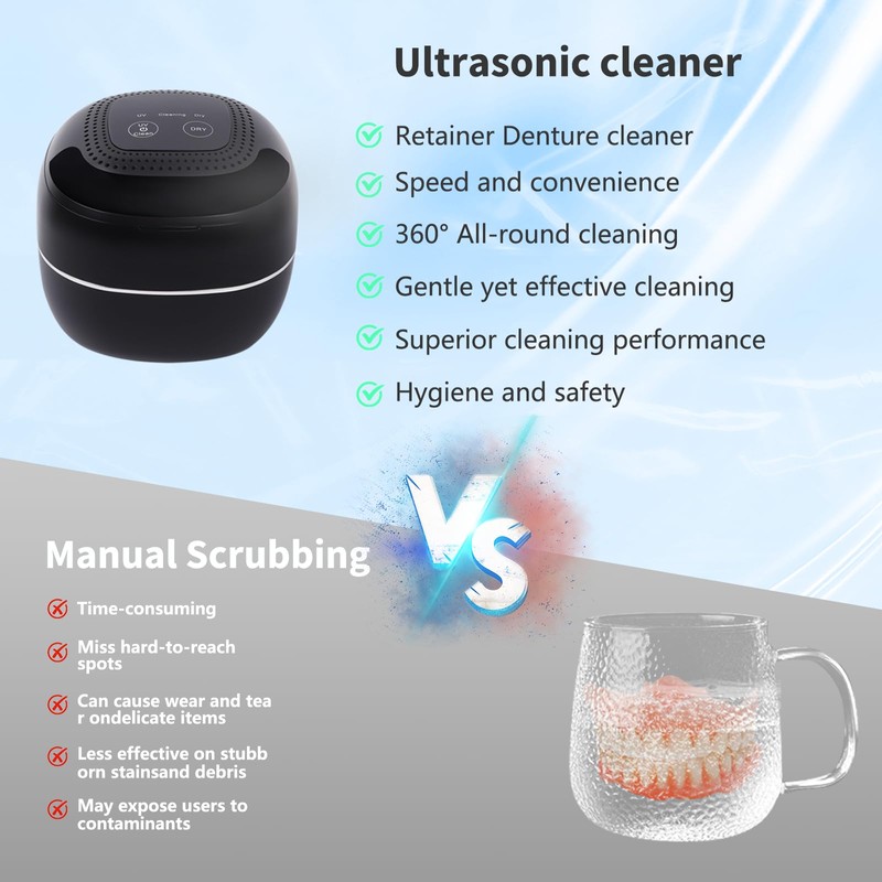 - Portable and User-Friendly: Designed for convenience, this retainer cleaner machine is compact and lightweight, making it easy to use and transport. It's perfect for home use or travel, ensuring your dental products remain clean anywhere you go.