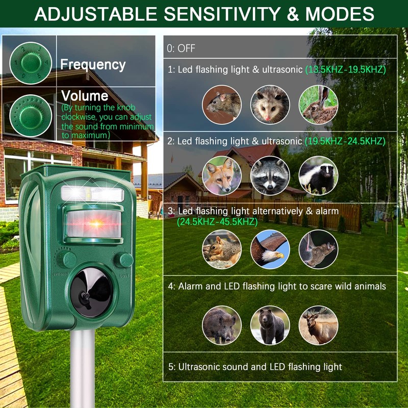 - Easy to Use: This ultrasonic deer repellent is easy to use and setting. Simply insert the bird repellent in sunny soil or an area frequently disturbed by bird and turn it on. Stay 5 inches above the ground, depending on the height of the predator you want to deter. For best results, you can adjust the item sensitivity and frequency according to different environments to increase the range of protection.