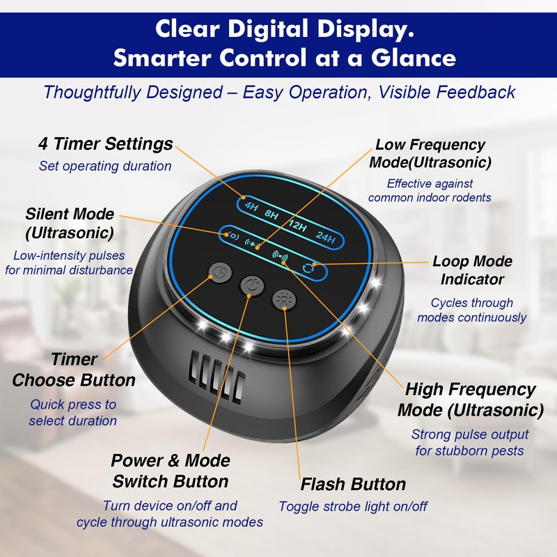 • Four Sound Modes:Offers four pre-set frequency (20KHZ to 65KHZ), each with a distinct waveform. Tap the front button to switch modes. Mode confirmation via individual LED indicators.